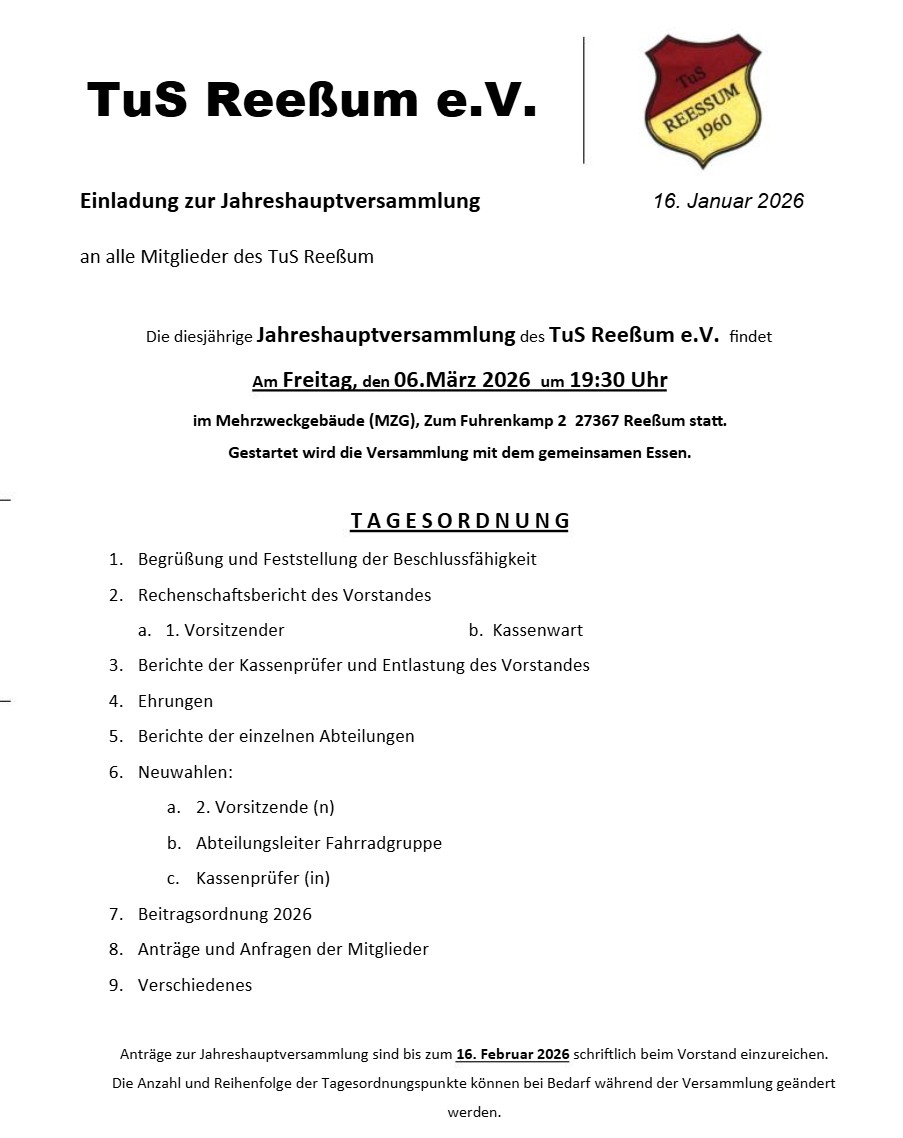 Die diesjährige Jahreshauptversammlung des TuS Reeßum e.V. findet
